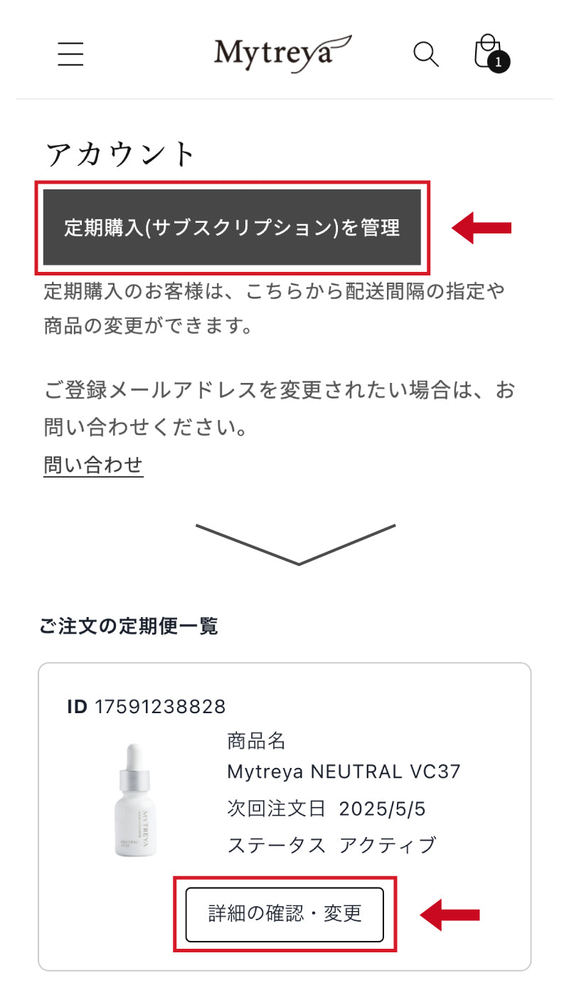 マイページ > 定期購入(サブスクリプション)を管理 > 詳細の確認・変更 >